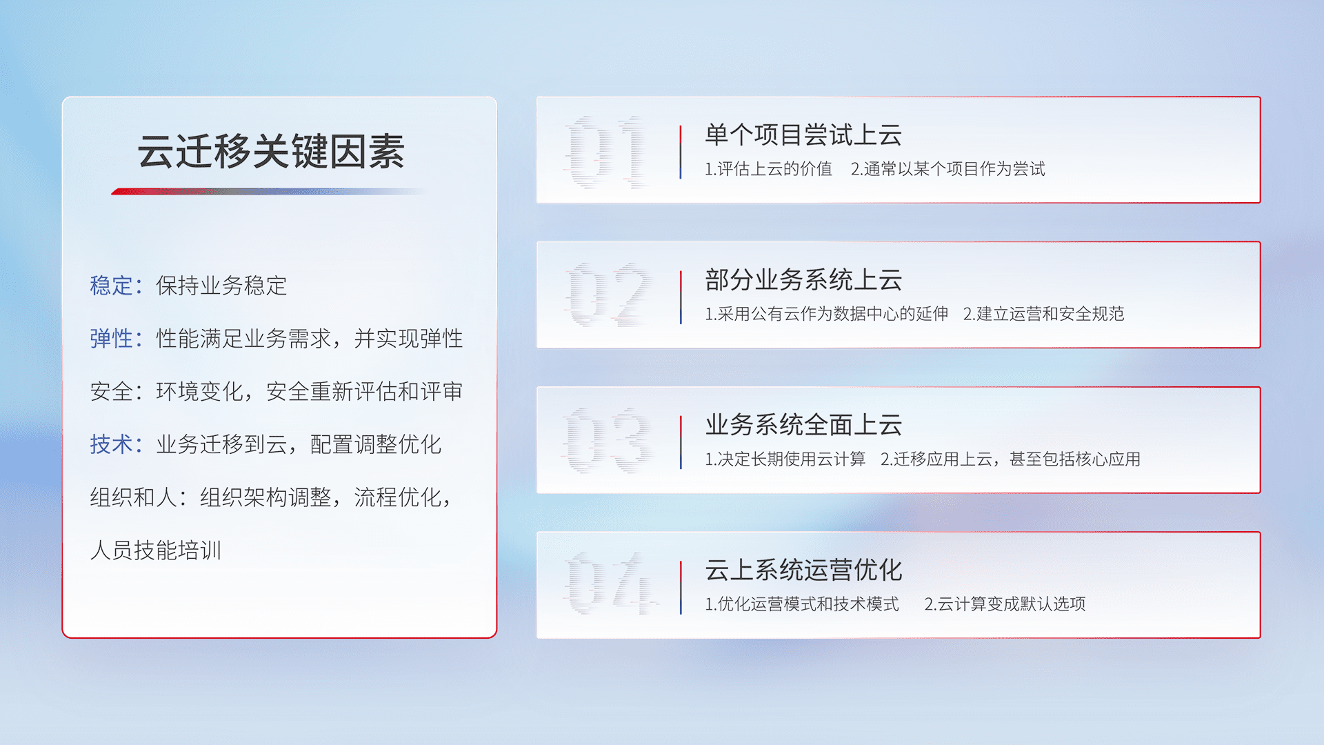 结合实际业务,,从规划设计、、、、云平台选型、、云原生改造、、、、数据迁移、、、集成交付,,,,迁移全过程为客户识别最佳上云路径,,做好风险识别管理,,,,设计网络架构、、、、身份权限、、安全审计合规、、操作审计、、日志审计、、、监控告警策略、、、、多站点容灾设计等,,,,对云上基础设施进行整体规划,,提升IT治理水平,,,以满足弹性、、、高可用、、、高性能的需求。。。